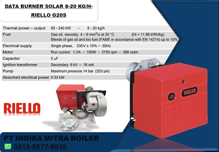 Burner solar kapasitas 20 Kg/liter per jam ini kami redy kan di indonesia dengan mrek Riello R40 seri G20s memiliki pengoprsian satu tahap dan desain perhatian khusus diberikan pada pengurangan kebisingan, kemudahan pemasangan dan penyesuaian, serta ukuran sekecil mungkin agar sesuai dengan semua jenis boiler yang tersedia di pasaran.