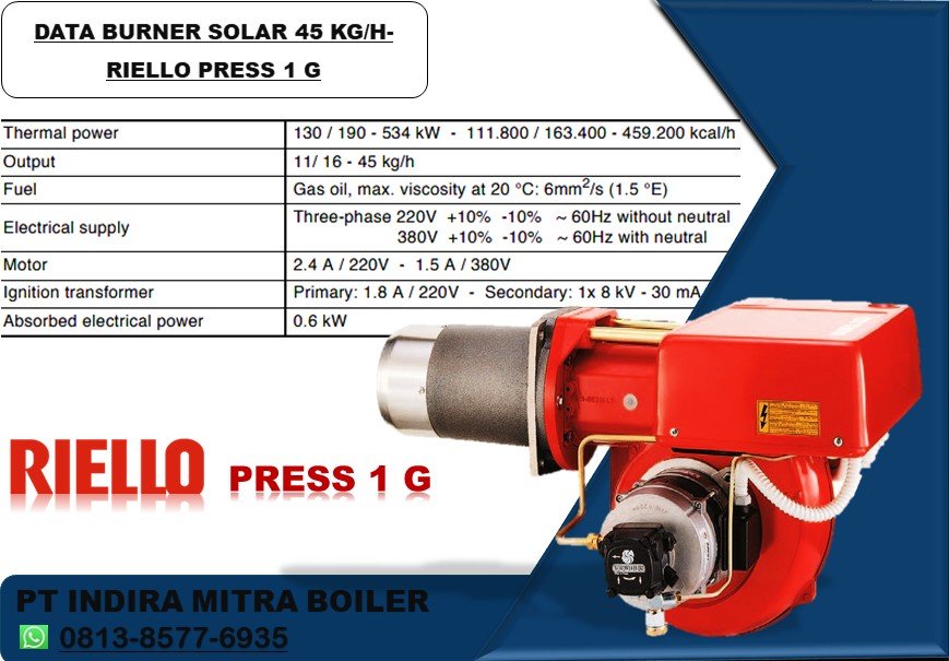 Pembakaran Burner Solar kapasitas 45 Kg/Liter per jam dari Mrek Riello Press 1G adalah salah satu produk yang banyak di gunakan pada aplikasi berat seperti peleburan, pemanasan suhu tunggi, dan untuk pekerjaan 24 jam non stop. Burner ini memiliki kontruksi yang kokoh dan kuat dengan bahan body besi cor sehingga mampu menghasilkan panas hingga 459.000 kcal/jam dengan temperatur hingga 1200 °C atau lebih tergantung pada model ruang pembakar dan dimensinya.