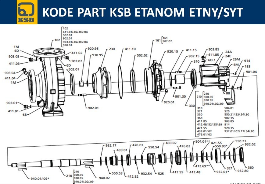 Description Part Number Description Part Number Volute casing 102 Hexagon head bolt 901.04/.30 Casing cover 161 Stud 902.01/.15 Support foot 183 Screw plug 903.01/.02/.03/.04/.85 Shaft 210 Pan head screw 914 Impeller 230 Nut 920.01/.15/.95 Plain bearing 310 Safety device 930.95 Radial ball bearing 321 Circlip 932.02/.80 Bearing bracket 330 Key 940.01/.02 Bearing cover 360 Joint ring 411.01/.02/.03/.04/.10/.15/.85 Connection O-ring 412.48/.55/.69 Pressure gauge connection 1M Lip seal 421.55.00 Temperature measurement connection 4M Mechanical seal 433 Fluid drain 6B Mating ring carrier 476 Fluid priming and venting 6D, 6D.1 Casing wear ring 502.01/.029) Leakage drain 8B Spacer ring 504.01.00 Shock pulse measurement connection 26M Disc 550.21.00 Keunggulan Produk KSB Etanorm ETNY