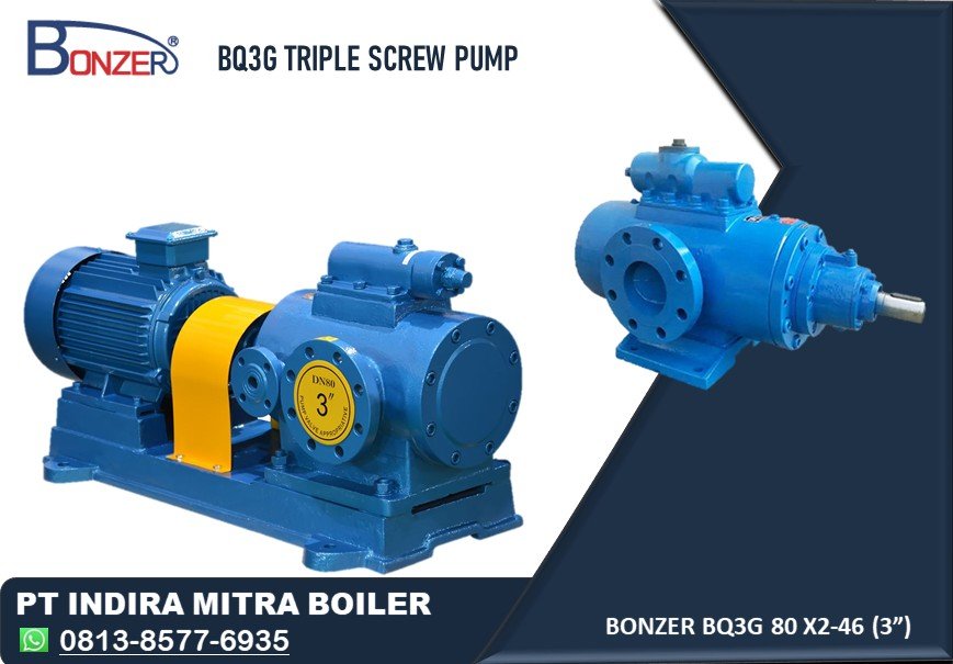 Pompa jenis Screw Pump yang diproduksi oleh Bonzer, model BQ3G 80×2-46, adalah pompa dengan mekanisme perpindahan positif yang berasal dari Taiwan atau Cina. Umumnya, pompa ini digunakan untuk memindahkan cairan kental di bawah tekanan tinggi. Tiga sekrup di dalamnya berfungsi untuk mendorong cairan yang dipompa ke depan dalam ruang tertutup. Ketika sekrup berputar di arah yang berbeda, cairan yang sedang dipindahkan akan bergerak sepanjang poros sekrup tersebut.