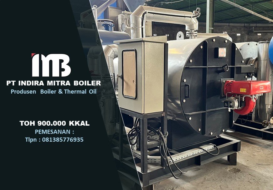 Thermal oil heater kapasitas 900.000 Kkal/h adalah sistem pemanas yang menggunakan fluida transfer panas dengan mediaminyak HTO jenis mineral atau sintetik pada temperatur 180-320 °C atau lebih tergantung kebutuhan proses produksi yang di perlukan. Tidak seperti boiler uap, thermal oil heater ini beroperasi pada tekanan yang lebih rendah, sehingga memungkinkan pengoperasian yang lebih aman sekaligus mencapai kontrol suhu yang tepat. Sistem ini ideal untuk aplikasi yang membutuhkan panas yang konsisten dalam jangka waktu yang lama, seperti di industri kimia, pengolahan makanan, Manufatur peanting, dan lain-lain.